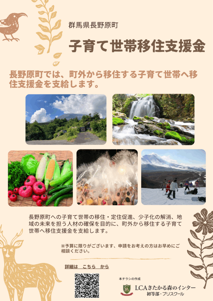 きたかる森のインターの入学に際しまして、移住を検討されている方向けに移住補助金の情報です。大きく分けて2つありますので、ご確認ください。
