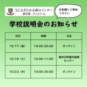 「LCAきたかる森のインター初等部・プリスクール」への入園・入学をご検討の保護者向け説明会を下記日程で開催します。