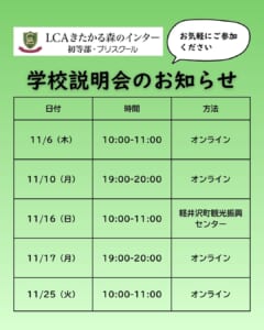 「LCAきたかる森のインター初等部・プリスクール」への入園・入学をご検討の保護者向け説明会を下記日程で開催します。