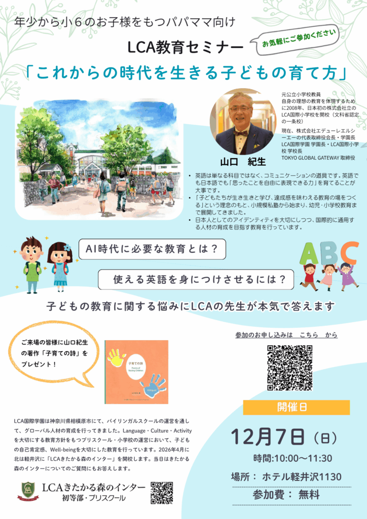 12/7(日)のホテル軽井沢1130において、LCAセミナー「これからの時代を生きる子どもたちの育て方」を開催します。