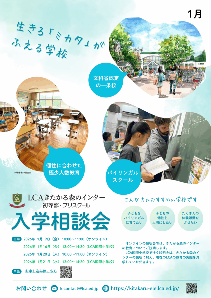 「LCAきたかる森のインター初等部・プリスクール」への入園・入学をご検討の保護者向け入学相談会を下記日程で開催します。